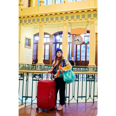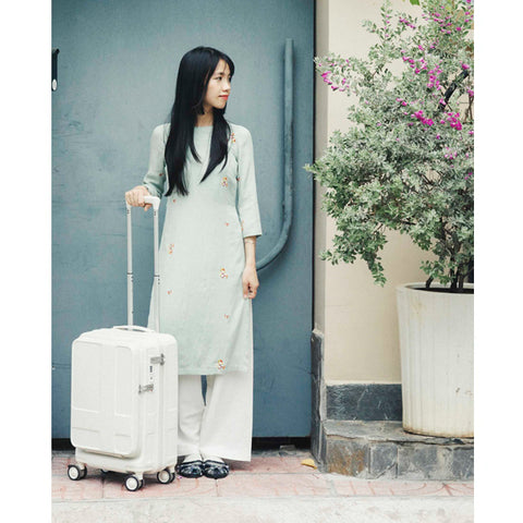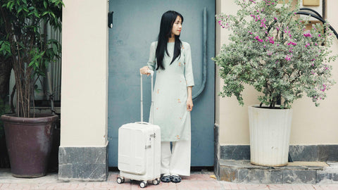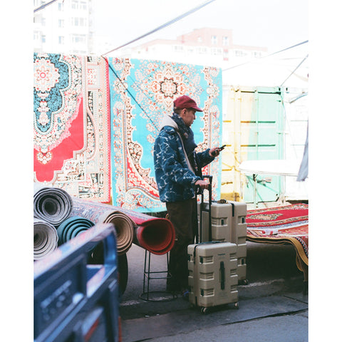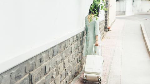 柔らかな光に包まれた港で、彼女は静かにフェリーへと足を踏み出す。手にするのは旅の相棒innovatorのスーツケース。