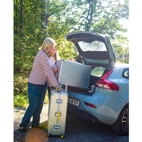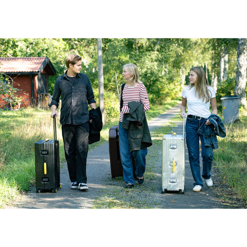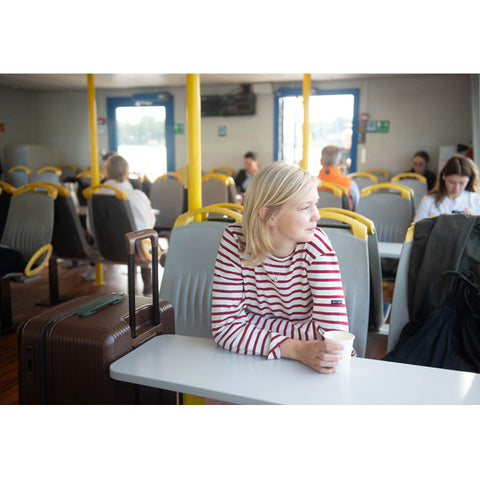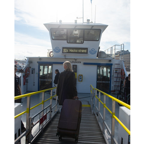 柔らかな光に包まれた港で、彼女は静かにフェリーへと足を踏み出す。手にするのは旅の相棒innovatorのスーツケース。